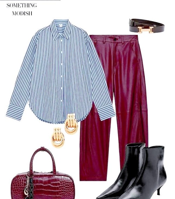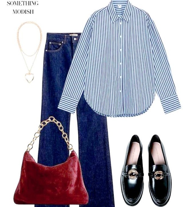 0.3厘米窄条竖条纹组合喇叭裤,增加摩登感,小包包提升整体活力。第五套穿搭建议:竖条纹衬衫与喇叭裤的组合。选择0.3厘米窄条的衬衫,相比宽条更显瘦身效果,扣子全部系上,领口处留出两颗,既展现锁骨又不失端庄。喇叭裤的设计从膝盖开始外扩,巧妙隐藏小腿肌肉,走路时显得轻盈飘逸。搭配一款酒红色的包包作为点缀,虽然面积小,却能瞬间提升整身灰蓝搭配的活力,即使下班后直接去聚餐,也不必担心显得寒酸。