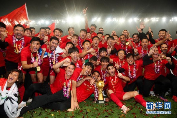 图为2018年11月7日,上海上港队在颁奖仪式上庆祝夺冠。当日,在2018赛季中超联赛第29轮比赛中,上海上港队主场以2比1战胜北京人和队,提前一轮夺得本赛季冠军。 新华社记者 丁汀 摄