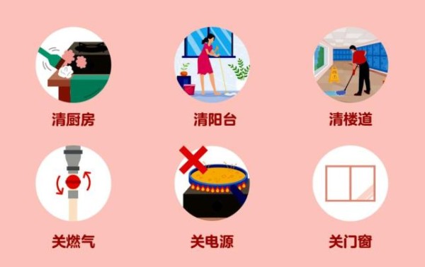 外出时切记“三清三关”:清楼道、清阳台、清厨房,关火源、关电源、关气源。