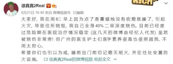 除了厨房,家中使用明火也要注意安全。几天前,嘻哈歌手徐真真发布微博:因为点了香薰蜡烛,没有吹熄就睡了,结果引起火灾,不仅住所被烧毁,自己更是全身40%二级深度烧伤。