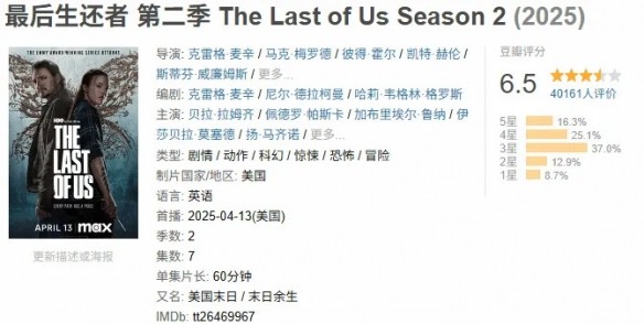 《最后生还者》第二季延续了乔尔与艾莉在末日世界中的旅程。尽管本季在观众评价方面表现不一——豆瓣评分仅为6.5,IGN单集评分介于6至9分之间——但仍凭借其整体影响力获得评审认可。本届“最佳影视改编”奖项竞争颇为激烈,同期入围的还有《我的世界》大电影、《鬼泣》、《细胞分裂:死亡监视》以及《直到黎明》等作品。