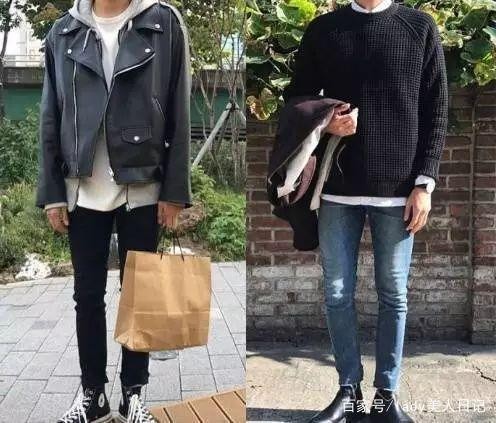 黑色机车皮外套+连帽运动服+白色打底衫+黑色休闲裤,叠穿的方法十分潮流,秋冬之时叠穿保暖又时髦,黑色的机车外套朋克风十足,非常有风格的穿搭。黑色针织毛衣+白衬衫+牛仔休闲裤,这样的穿法非常商务,绅士又时髦,搭配牛仔裤慵懒舒适。