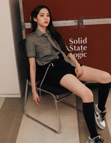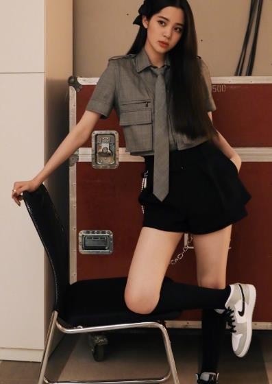 坐在简易椅子上的欧阳娜娜,帅炸了。长发及腰发型加上头发侧边夹着黑色发夹的娜娜立马化身甜酷girl,穿着深灰色衬衫搭配黑色高腰短裙,脚踩一双拼接色运动鞋内搭黑色长筒袜,活力值满格。翻领衬衫搭配一条同色系领带,设计感十足。衣服上口袋设计很有工装风。