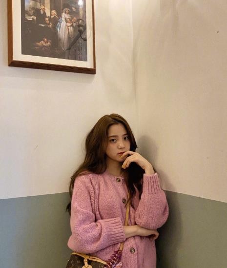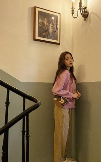 反季节穿搭小达人欧阳娜娜,穿粉毛衣配杏色直筒裤,少女必备