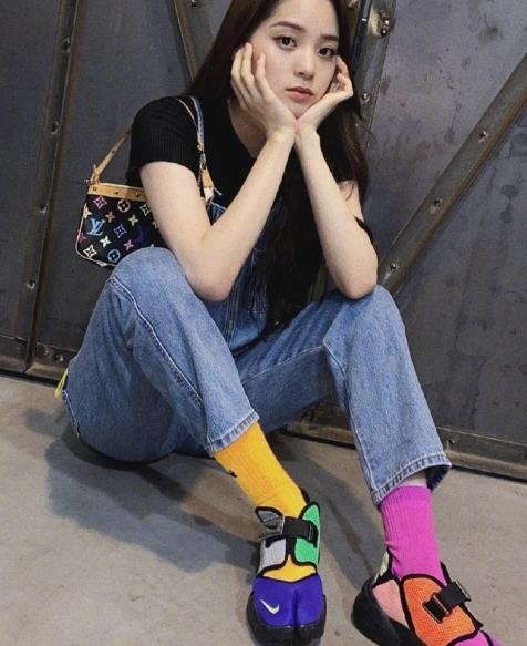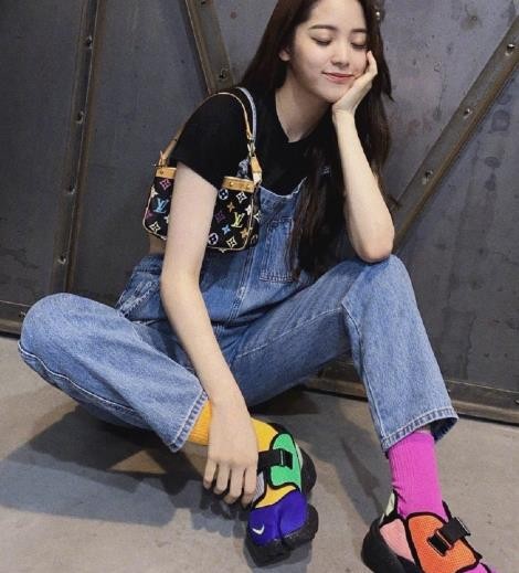 整体穿搭最大的亮点是Nike糖果色系马蹄鞋很有特色,配色丰富、鞋型新颖独特、内搭的袜子也很少女心,玫红色与黄色非常夏天,给人青春舒适的活力感。欧阳娜娜单肩背着一个Vintage Louis Vuitton单肩包,小巧自然也为整体造型增色不少。这样的穿搭很适合青春活力的学生党,妥妥的清甜范。