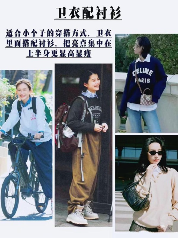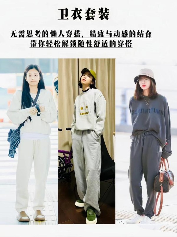 宽松的卫衣套装,休闲舒适也很自在。卫衣+卫裤,配上运动鞋满满的活力感。运动鞋尽量搭配厚底或者高帮的款式,更显高也更洋气。