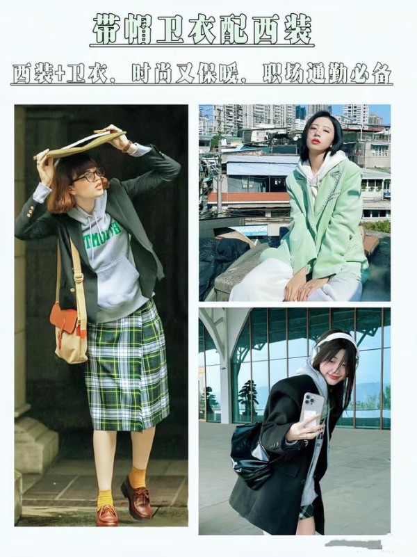尤其是比较年轻的上班族,担心穿衬衫太死板、穿打底衫太单调,那么连帽卫衣作为内搭、活泼又不失体面,就是刚刚好的选择。