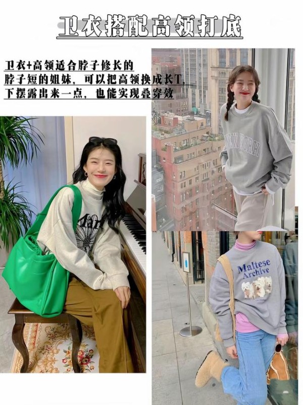 不少人认为,只有连帽卫衣适合叠穿。其实这种常规的圆领卫衣,也完全可以用来叠穿。我们只需要选择高领或者半高领的打底衫就对了。