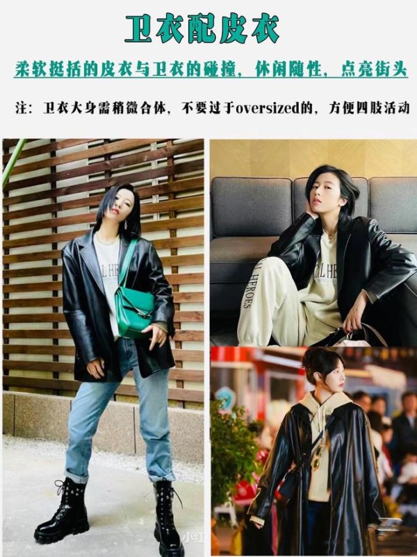 休闲随性,又带着几分不羁,这样的穿搭,就适合很有性格的女孩子。挺括且柔软的皮衣,配上宽松休闲的卫衣,成为街头最靓的风景,