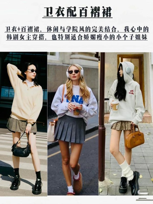 休闲风卫衣,搭配高腰的百褶裙。百褶裙一定是短款的版型,露出修长的双腿,显腿长又很显高,搭配厚底短靴更适合小个子。