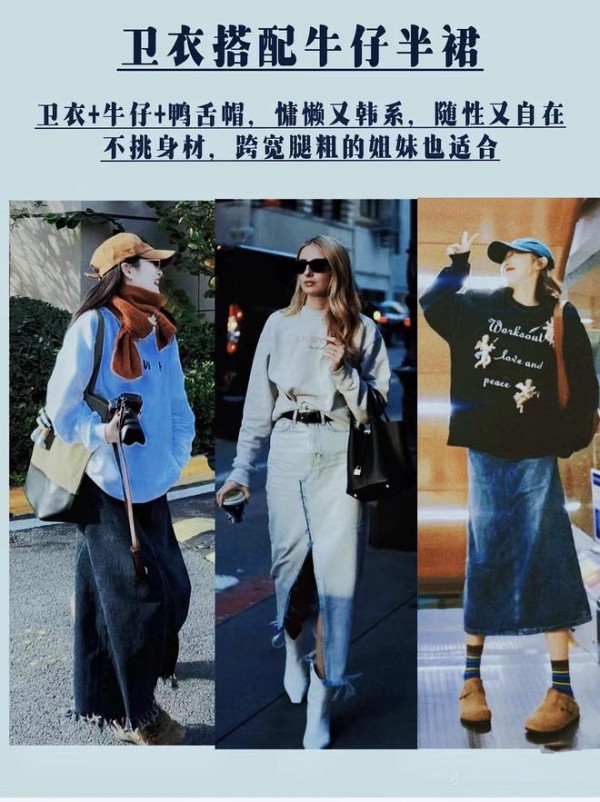 宽松一点的卫衣,舒适又活泼。搭配适当合身的高腰牛仔半身裙,牛仔半身裙尽量配A字形的剪裁,自然遮盖腰胯、露出小腿更显身材纤细苗条。