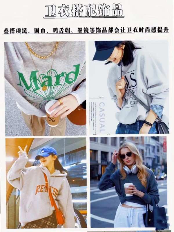 宽松的休闲风卫衣,叠搭毛衣链、鸭舌帽、墨镜或者耳机,都可以更洋气酷飒。宽松的休闲风卫衣,随便搭配醒目的配饰就会格外的洋气。