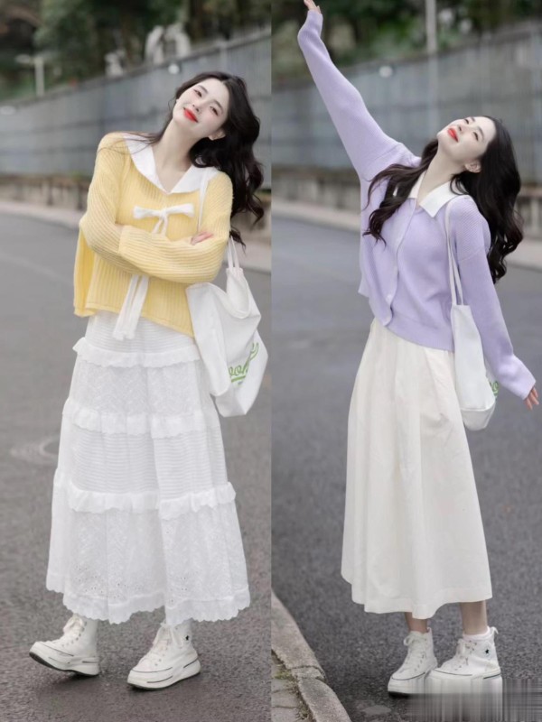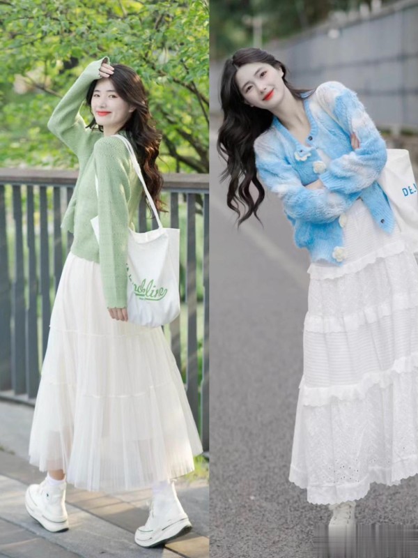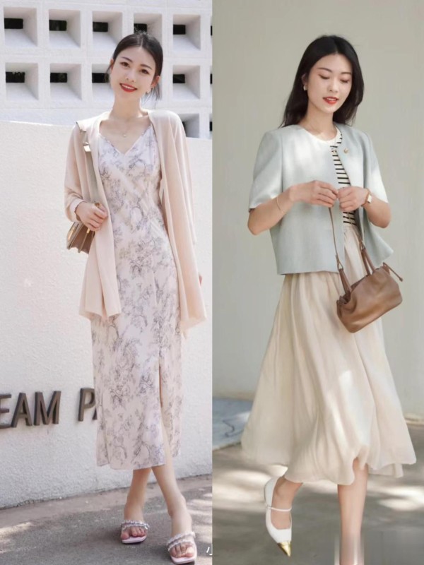 我们穿连衣裙或者半身裙的时候,都可以搭配小外套来塑造气质美。比如宽松的针织衫、或者挺阔的小香风外套,配裙装都很显气质。