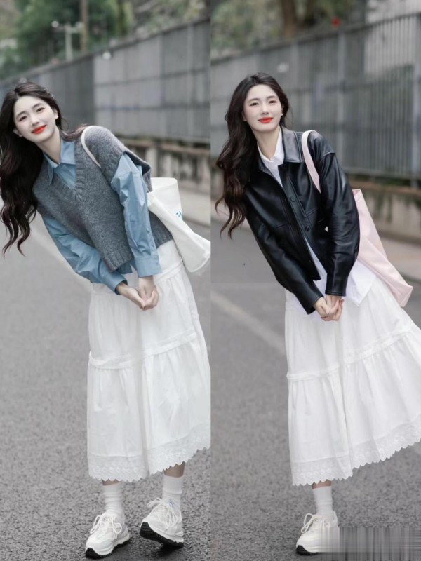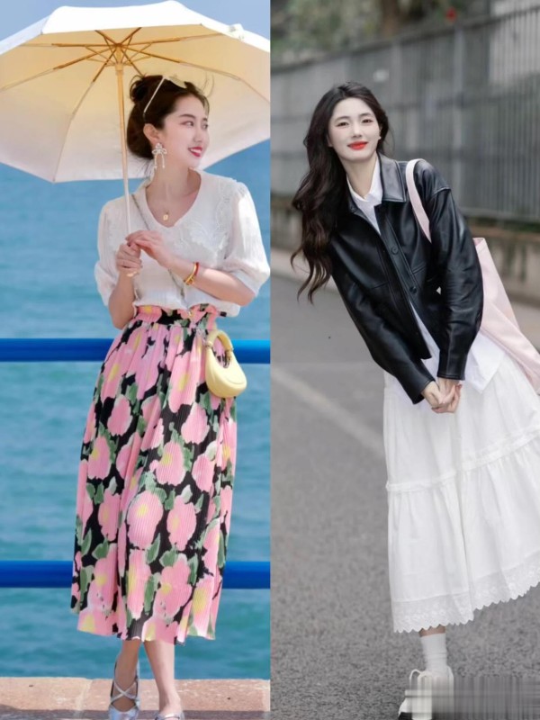 如果你喜欢一种更加惹眼的穿衣风格,我们可以尝试撞色的搭配。比如白色衬衫配印花半身裙,或者黑色皮衣外套配白色半身裙。