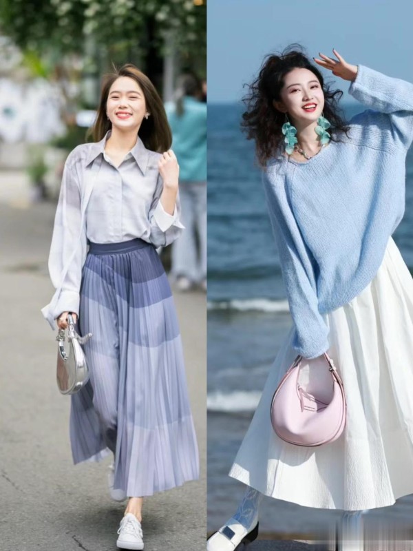 比如我们穿宽松的针织衫,搭配了高腰的半身裙,只是在侧腰的位置将针织衫的下摆塞个衣角。就勾勒出更窈窕的曲线美。这种白色半身裙配蓝色针织衫,也是洋气大方。