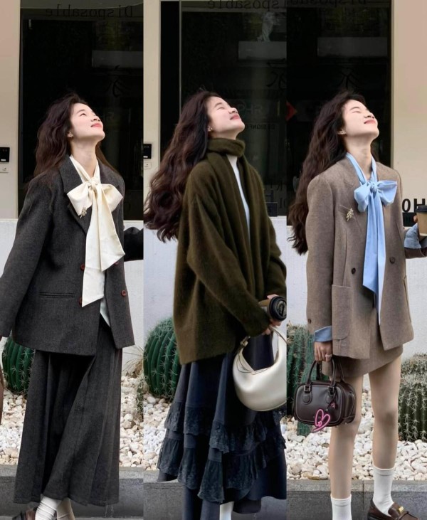 在塑造秋季穿搭的时候,可能很多人会觉得,单品的叠加会让造型显得厚重无比,这个时候,其实建议大家加入飘带这一元素,通过飘带的融入,体现出一些些轻盈的风格和一定的层次感。