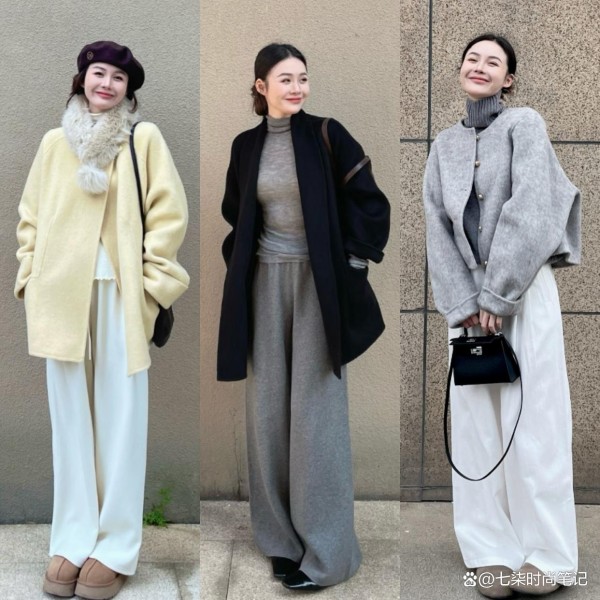 毛呢大衣和阔腿裤的组合,既藏肉又显气质,淡淡柔柔的奶黄色穿上身超级显嫩,搭配白色阔腿裤,全身浅色系自带温柔滤镜,清爽又高级。