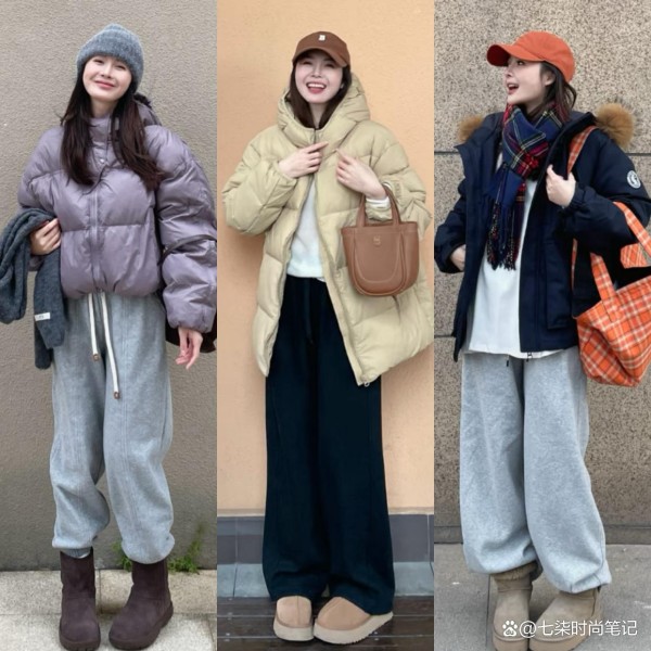 淡紫色羽绒服简约又吸睛,还能打破冬日的沉闷,短款设计显高又利落,搭配灰色卫裤和雪地靴,青春活力十足,日常穿舒适又好看。