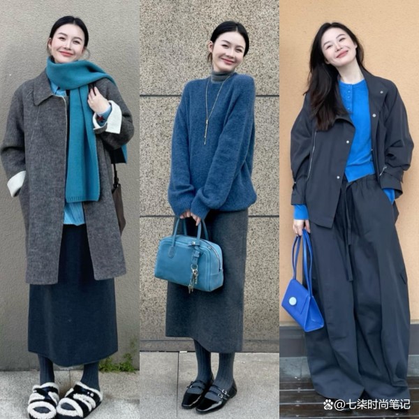 蓝色亮眼又不会太高调,即使大龄女性也可以轻松驾驭。好喜欢博主的灰蓝配色,低调又显质感,每一套都好好看。