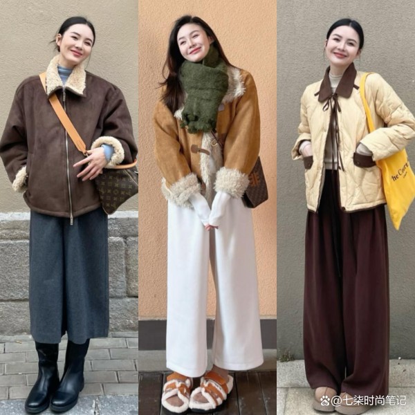 冬天如果穿腻了大衣、羽绒服,自带复古滤镜的皮毛一体和巴恩风外套绝对值得一试,棕色自带暖意,无论是搭配灰色还是白色裤子都超有质感。