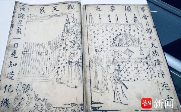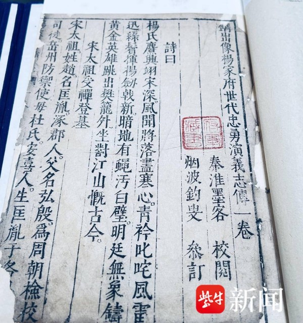 这本古籍来自南京本地书店“真德旧书坊”,全名为《镌出像杨家府世代忠勇演义志传》,是明万历三十四年(1606年)的卧松阁刊本,记者看到,该书内部分书页已经残损,但仍保存了“太祖受禅登基”“继业夜观天象”等精美的明代版画。该书署名为:秦淮墨客校阅、烟波钓叟参订。秦淮墨客是明代戏曲作家、南京人纪振伦的号。