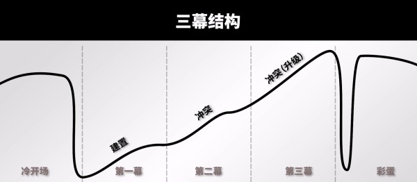 建置阶段 —— 引入冲突 —— 冲突升级 —— 高潮 —— 然后结束,但是近20年间,以好莱坞的预告为首,这种套路开始产生变体,因为视频时代,观众的节奏一直被不断的拉高,他们需要更多的时间刺激,三幕之前会插入一个冷开场,之后会加入最后的彩蛋。