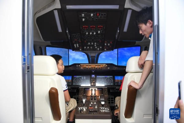 9月17日,在全国科普日北京主场活动展区,两名小朋友在体验C919模拟驾驶器。