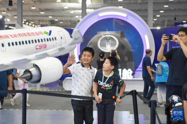9月17日,在全国科普日北京主场活动展区,参观者参观展出的C919大飞机模型。