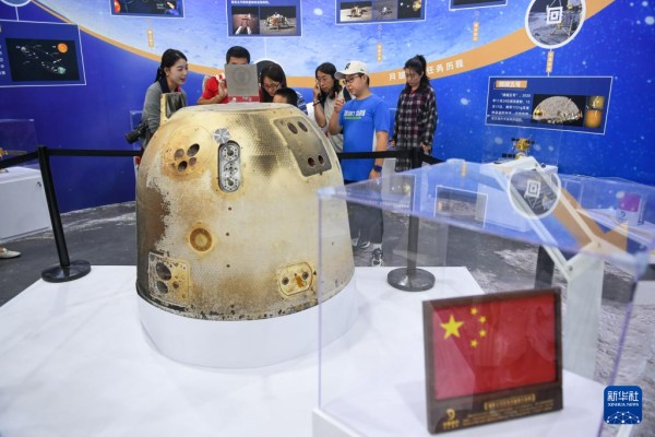 9月17日,在全国科普日北京主场活动展区,参观者参观展出的嫦娥五号再入返回飞行试验任务返回器。