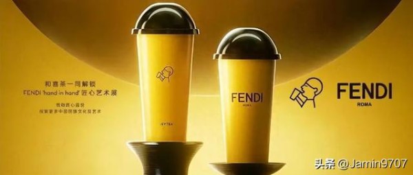 喜茶 X FENDI2023年5月17日,茶饮品牌喜茶与意大利奢侈品品牌FENDI(芬迪)携手推出“FENDI喜悦黄”茶饮,单杯售价为19元,38元买两杯还能选一个杯垫或者徽章周边。联名活动效果显著,喜茶门店订单爆满,社交媒体上热度持续攀升。此外,FENDI “handinhand”匠心艺术展的预约链接也显示目前已经被全部约满。有消费者晒出“FENDI喜悦黄”茶饮并表示“这是我离FENDI最近的一次。”