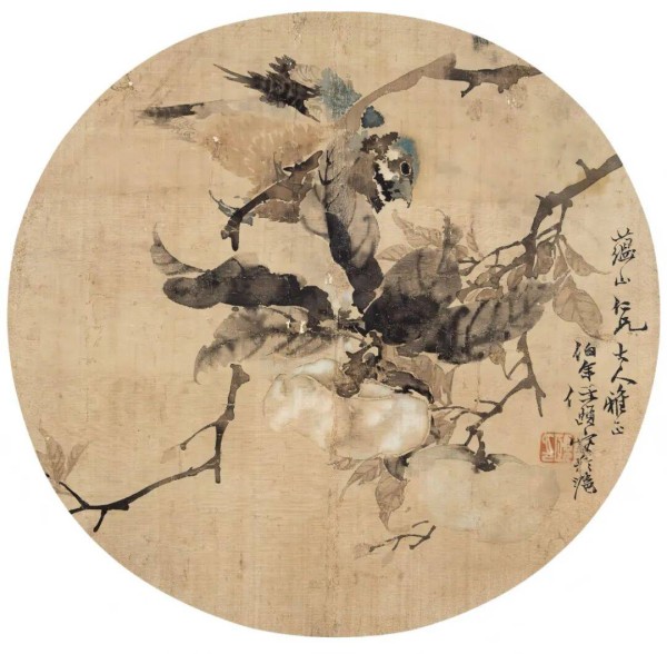 在取景视角上,任伯年有着独特的偏好——常用仰视视角,尤其是在画鸟时。仰视视角不仅还原了自然中观察鸟类的真实状态,还传递出昂扬向上的精神风貌,让扇面花鸟更具感染力。从自然观察的角度看,鸟类多栖息于枝头高处,人们仰望观察时,往往能清晰地看到鸟儿的腹部、脚爪和展开的翅羽,这种视角更符合日常观察的真实体验。任伯年深谙此道,在《如意图》纨扇(平湖博物馆藏)中,仰视视角下的燕子浑圆的肚子与纤细的尾羽形成鲜明对比,它翅羽微微张开,全神贯注意欲啄食柿子,情态生动可爱。
