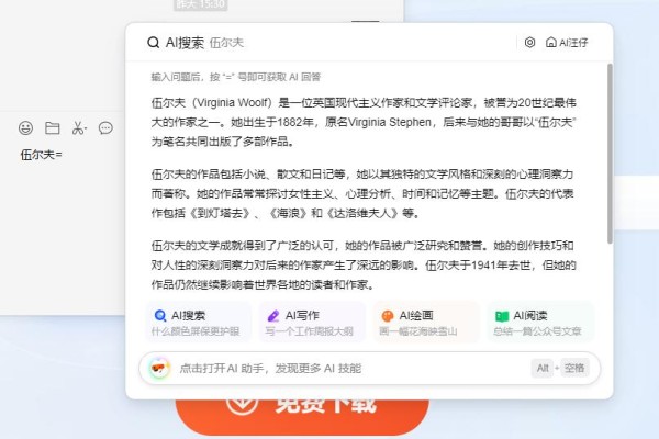 尤其是当柳林在做PPT时一时头脑短路,也不必再切换工具,在PPT和传统搜索引擎之间来回横跳,比如当她在做关于英国文学史的课题时,突然忘记某位作家的经典之作,就只需要在PPT界面输入作家名字,再输入“=”号,即可调起AI搜索,即时得到精准结果。