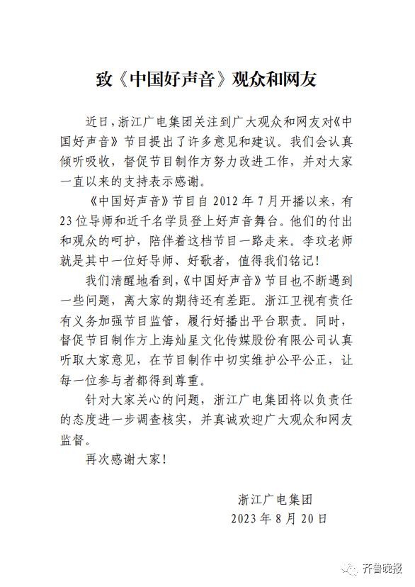 近日,浙江广电集团关注到广大观众和网友对《中国好声音》节目提出了许多意见和建议。我们会认真倾听吸收,督促节目制作方努力改进工作,并对大家一直以来的支持表示感谢。