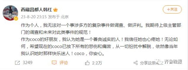 20日晚,韩红发文为好友李玟发声,她表示,期待上级主管部门的调查和未来对此类事件的规范。此外,韩红提到,作为coco的好朋友,自己认为对方是一个善良诚实的人,“我信任她也心疼她!”