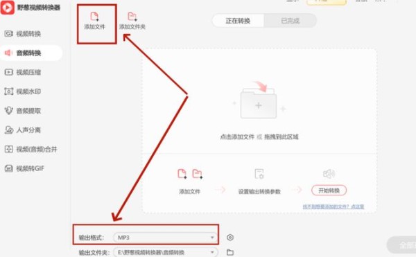 步骤2,点击“添加文件”上传音频,然后将输出格式设置为“MP3”等需要的格式类型。