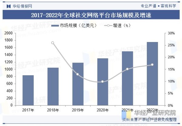 社交网络行业是近年来发展迅猛的互联网行业之一。随着互联网技术的不断发展和人们社交需求的改变,社交网络已经成为人们日常生活中不可或缺的一部分。全球社交网络平台市场规模迅速扩张,2022年全球社交网络平台市场规模达到1754.43亿美元,同比增长16.93%。