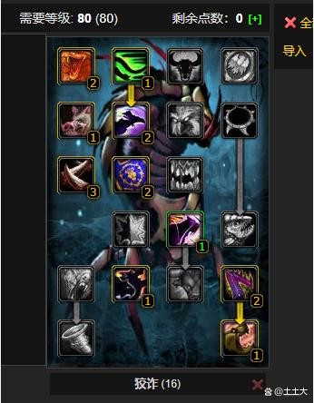 在WLK版本中,狡诈系的宠物宝宝都是比较适合PVP的,比如跃迁兽,螃蟹等。推荐加点天赋如下图。