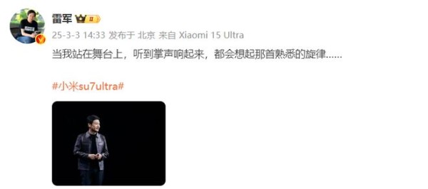 3月3日,小米创办人,董事长兼CEO雷军在个人社媒发布动态,晒出一张他在此前小米发布会上的照片,并配文:当我站在舞台上,听到掌声响起来,都会想起那首熟悉的旋律……