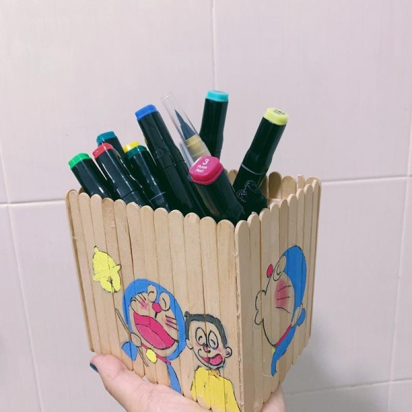 在小组交流中,同学们分享了各自的制作经验。刘星描述了他制作手工笔筒的过程:他巧妙地利用绿色卡纸,在纸杯上环绕一圈并粘牢,从而形成了笔筒的外观。之后,他精心绘制了面部图案,并用黄色卡纸制作了两个细长的胳膊。通过在纸杯两侧打孔,他将这两个胳膊巧妙地穿入,最终完成了一个既美观又实用的笔筒。