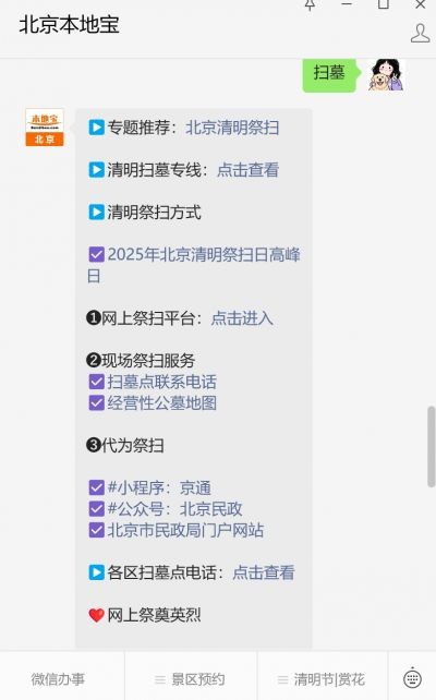 温馨提示:微信搜索公众号【北京本地宝】,关注后在对话框回复【扫墓】获2025年北京清明扫墓预约平台入口(现场祭扫/代为祭扫/网上祭扫)、预约时间/怎么预约/预约流程、各区扫墓点预约电话地址、扫墓专线、殡葬服务机构联系电话等。