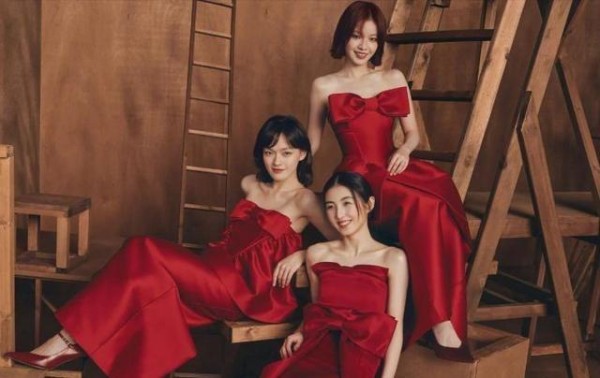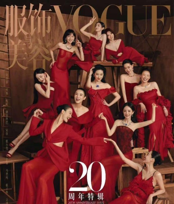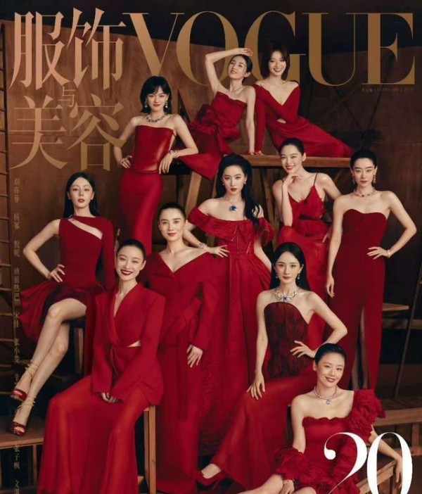 11个人穿着鲜亮的红裙,摆在封面上,杂志社那帮编辑可能觉得很“炫酷”,可是从咱们普通人的角度看,就是一大堆红色的影子,感觉乱哄哄的,反倒有点像“百花齐放”的感觉