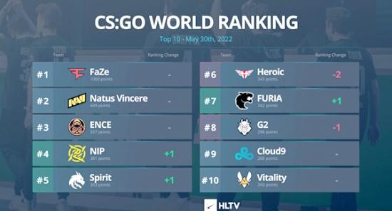 同时,在5月31日,《CS:GO》HLTV也公布了最新的世界排名。G2位列第八,而前三甲的位置依旧稳固。