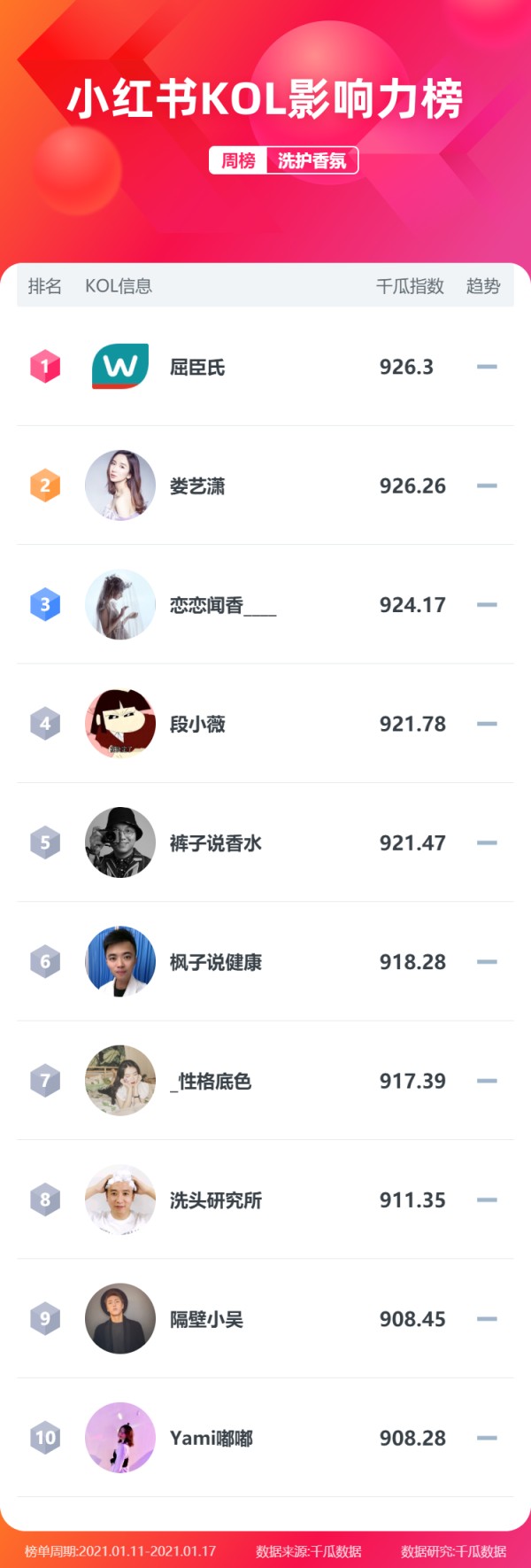 小红书KOL影响力榜-洗护香氛中,“屈臣氏“排名第一,千瓜指数926.3;“娄艺潇”排名第二,千瓜指数926.26;“恋恋闻香____”排名第三,千瓜指数924.17。