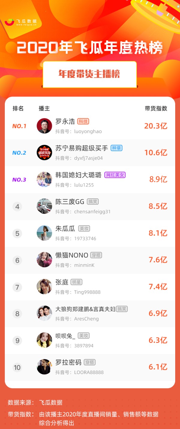 2020年抖音年度带货主播榜中,“罗永浩“排名第一,带货指数20.3亿;“娄艺潇苏宁易购超级买手”排名第二,带货指数10.6亿;“韩国媳妇大璐璐”排名第三,千瓜指数924.17带货指数8.9亿。