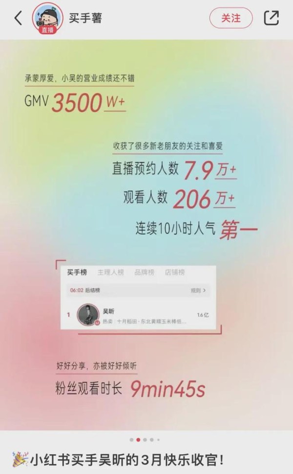 4月初,小红书官方账号发布吴昕3月直播带货的收官战报。吴昕3月直播两次,其中3月30日这场GMV突破3500万,单小时的热力值1亿+,成为站内第四个热度值破亿的明星主播。