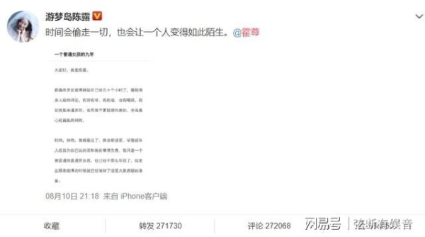 八月十号,霍尊的女友陈露在某社交平台发长文讲述了她跟霍尊的故事,并配文时间会偷走一切,也会让一个人变得陌生。文章的主题是一个普通女孩的九年。从陈露发的长文来看,2012年开始霍尊和陈露在一起,当时霍尊是没名气的歌手,陈露也是没有名气的舞蹈演员。但从霍尊唱《卷珠帘》之后有了名气,而陈露当时已经是副高级职称的教授了,但是为了照顾刚刚出名的霍尊,毅然辞去工作。