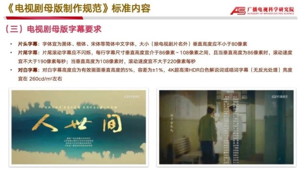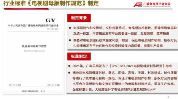 2021年广电总局发布了《GY/T 357-2021电视剧母版制作规范》行业标准,对电视剧母版时长、署名、图像、声音、字幕、封装格式、制作质量等进行了技术量化和统一规范,给出了电视剧母版声画质量主观评价方法建议,保证电视剧制作机构、版权方及内容播出平台在母版制作和交换时采用统一的参数和封装格式,减少转换处理,提高生产效率,强化标准引领,大幅度提升了电视剧制作水准及规范化水平。