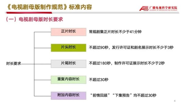 标准规定了电视剧母版时长、署名、字幕等方面的内容,还对电视剧母版的图像和声音要求和封装格式等技术指标进行了规范。