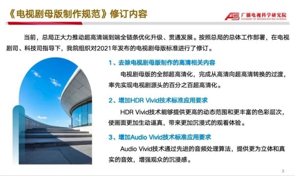 在广电总局电视剧司、科技司指导下,总局广播电视科学研究院组织对2021年发布的电视剧母版标准进行了修订。在首届中国广播电视精品创作大会超高清视听科技发展论坛上,总局广科院对新标准进行权威解读——