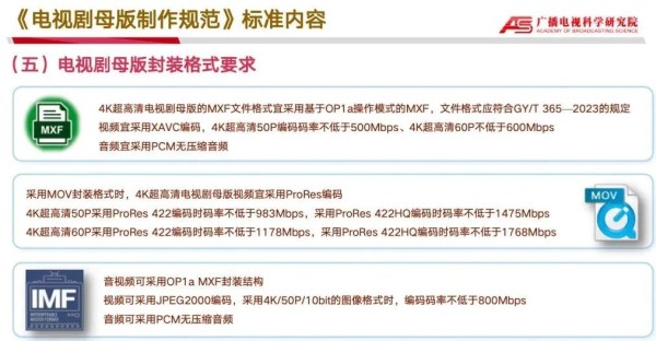 封装格式方面,建议采用MXF、MOV或IMF格式进行封装,并规定了每种封装格式对应的编码方式与编码码率,在保证电视剧母版声画质量的基础上,增强母版的兼容性和交换便利性。